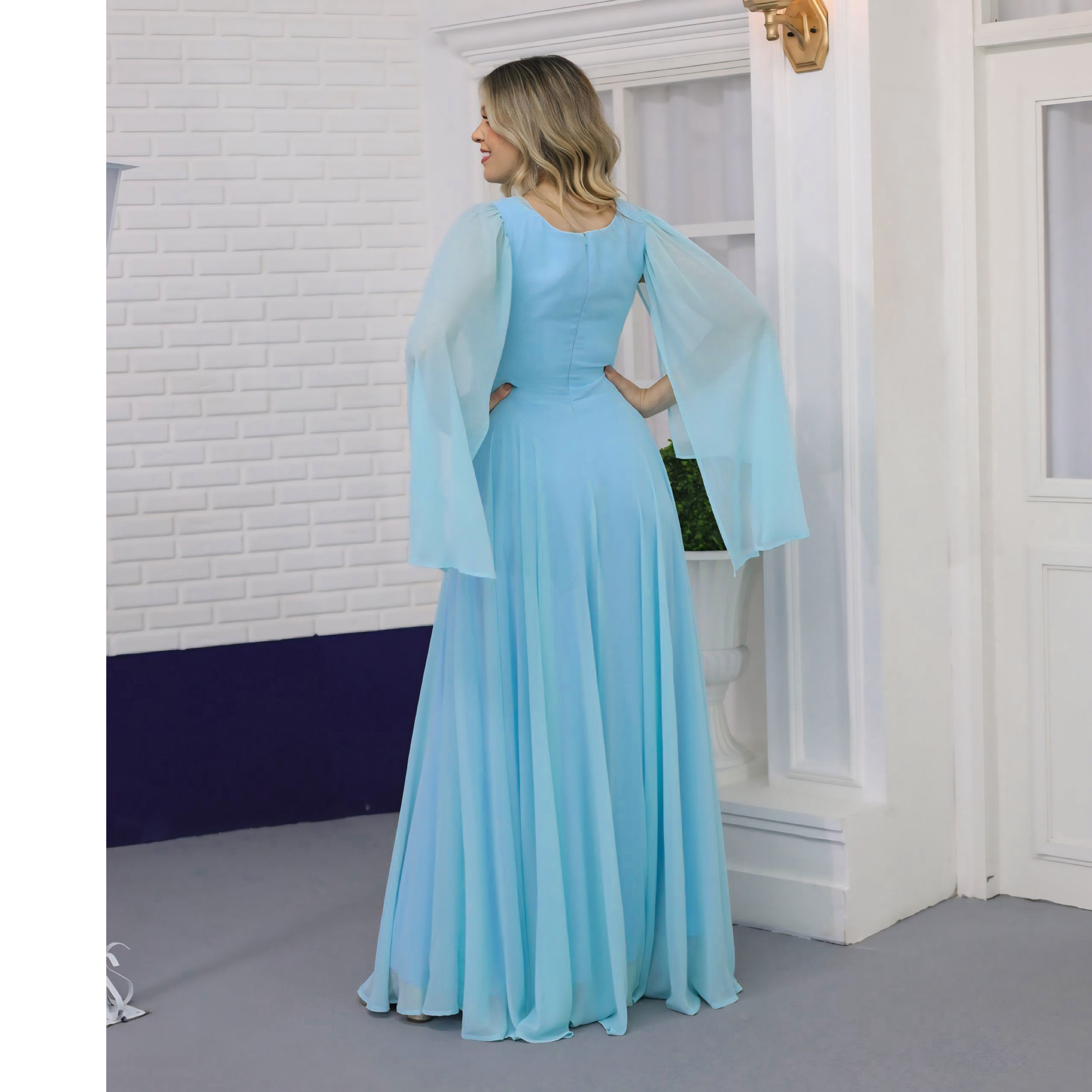 Vestido Tori Chiffon Capa, Busto Franzido e Saia Rodada – Azul Ceu