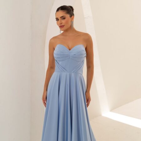 Vestido Jessica Cetim Tqc, Busto Prega e Saia Rodada – Azul Ceu
