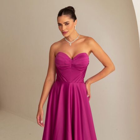 Vestido Jessica Cetim Tqc, Busto Prega e Saia Rodada – Fuchsia